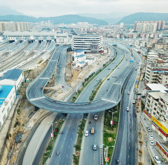 該項(xiàng)目屬于火車站北片區(qū)“一橫一縱一環(huán)”路網(wǎng)中的一環(huán),是火車站北站房片區(qū)的重點(diǎn)工程,也是連接羅龍路與火車站北站房旅客出發(fā)平臺(tái)的唯一通道,項(xiàng)目建成對(duì)完善片區(qū)功能開發(fā)需要具有重要意義。1月1日起,站前高架橋已順利通車,前往出發(fā)層的市民可從高架橋進(jìn)入北站房,而到站旅客將從廣場(chǎng)出站,進(jìn)出分流,交通疏導(dǎo)更加順暢。