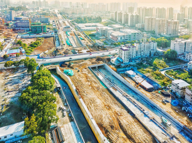 2017年9月開工。目前,下穿車型通道U型槽、箱型通道、排洪溝主體已完成,管廊主體結(jié)構(gòu)已完成45米