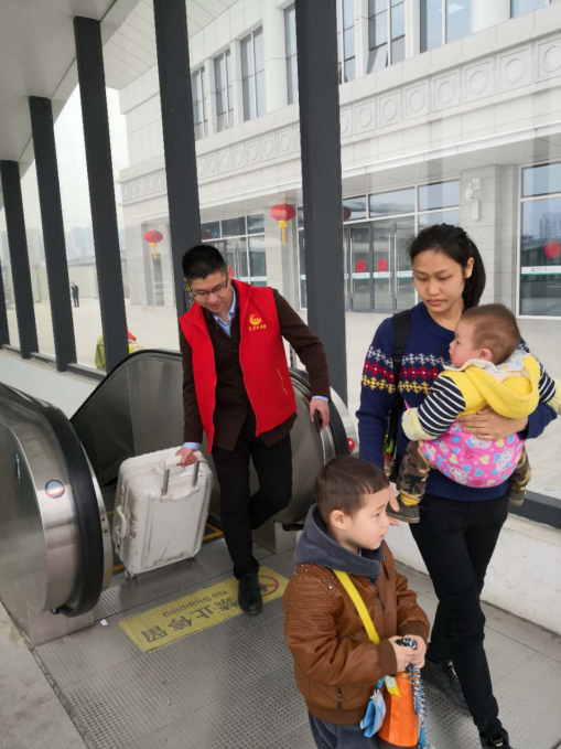 在火車站服務最需要幫助的有三種人:一種是殘疾人,一種是老年人,另外一種就是一手抱著小孩、一手提著行李的旅客。因新建火車站剛剛啟用,“請問進站口在哪兒?一位拿著大包小包還帶著孩子的旅客問到。“在這邊,我來幫你?!?/span>志愿者一邊指著路一邊接過旅客手中的包,一路將她送至進站口